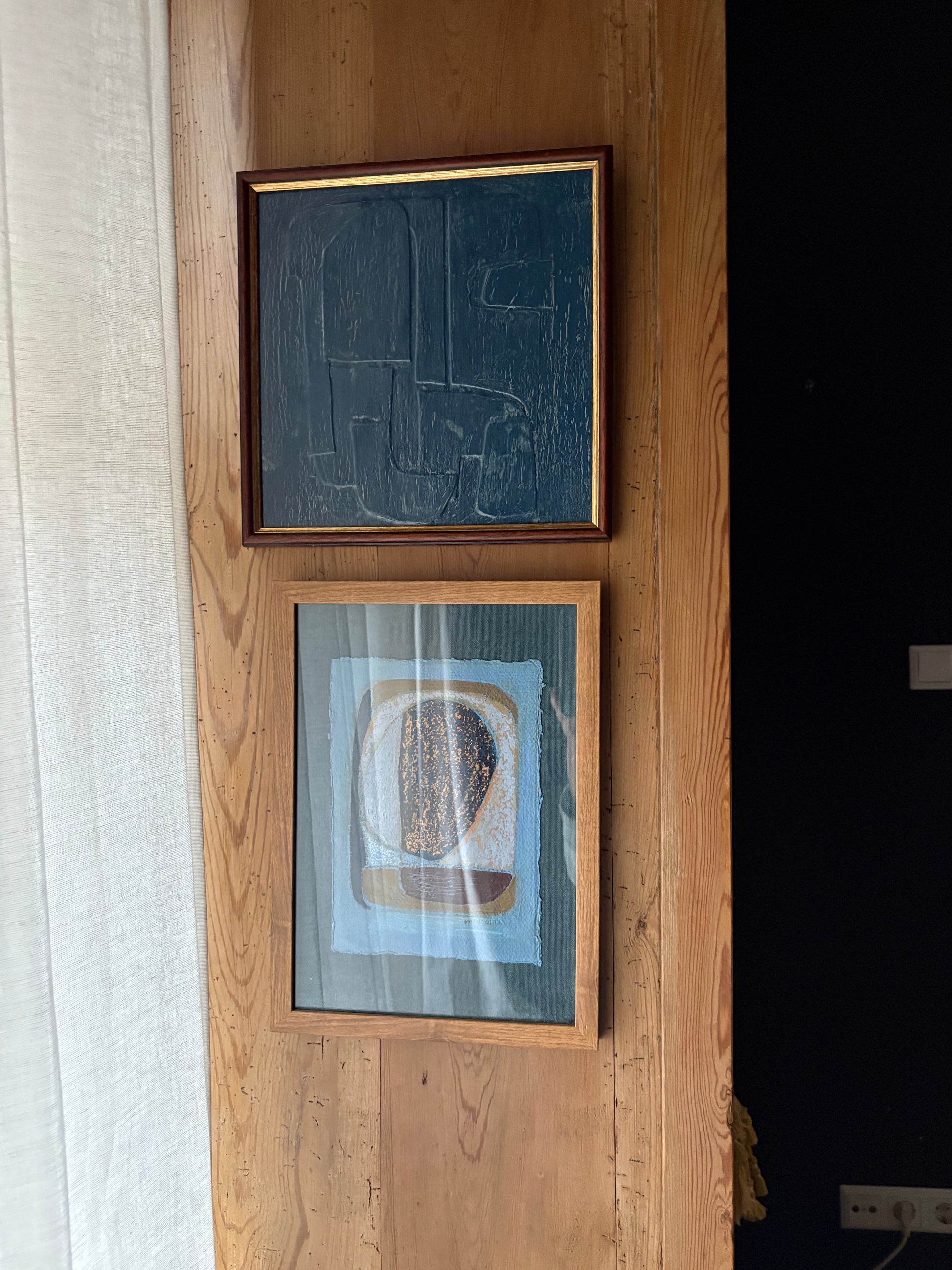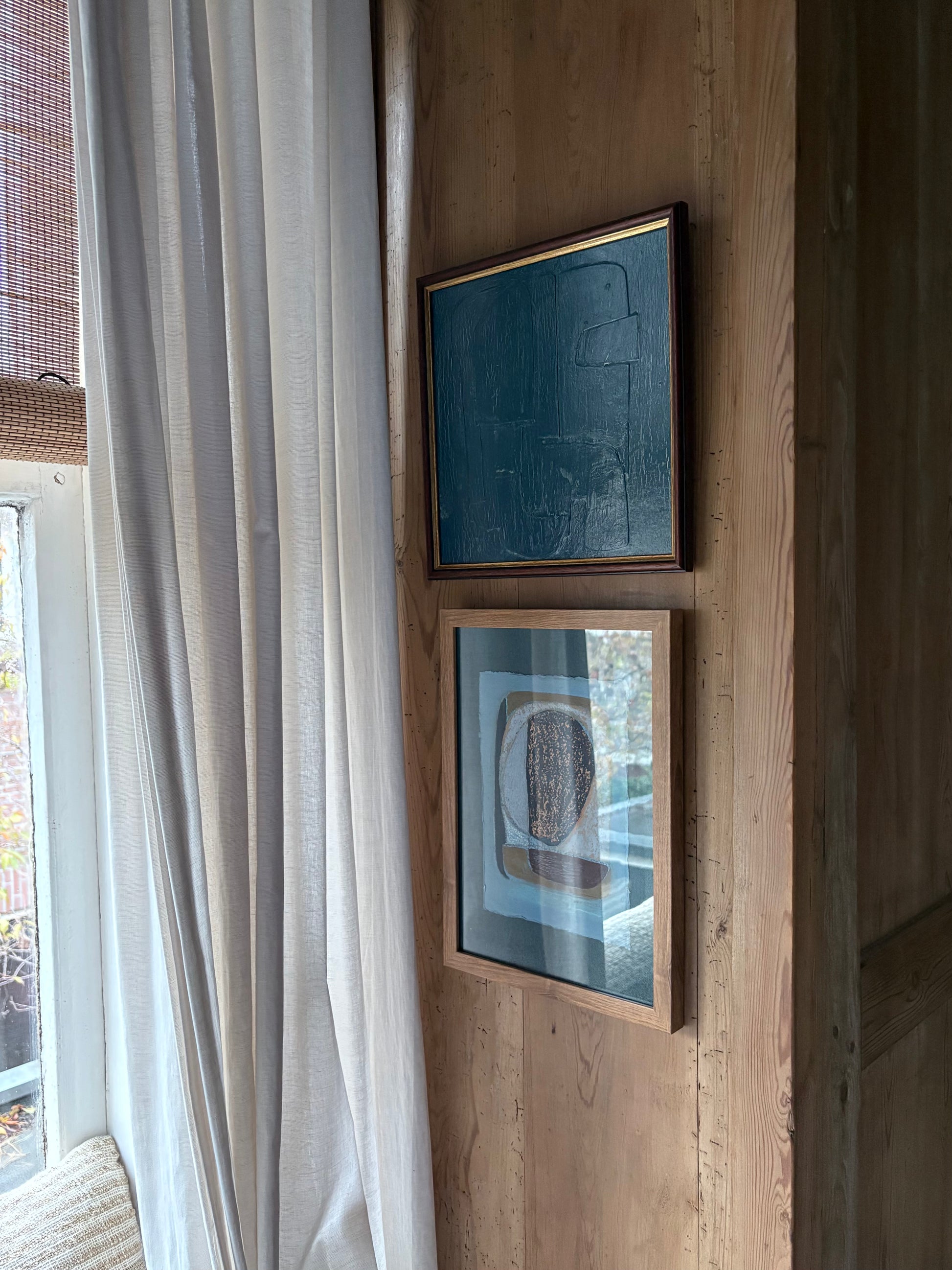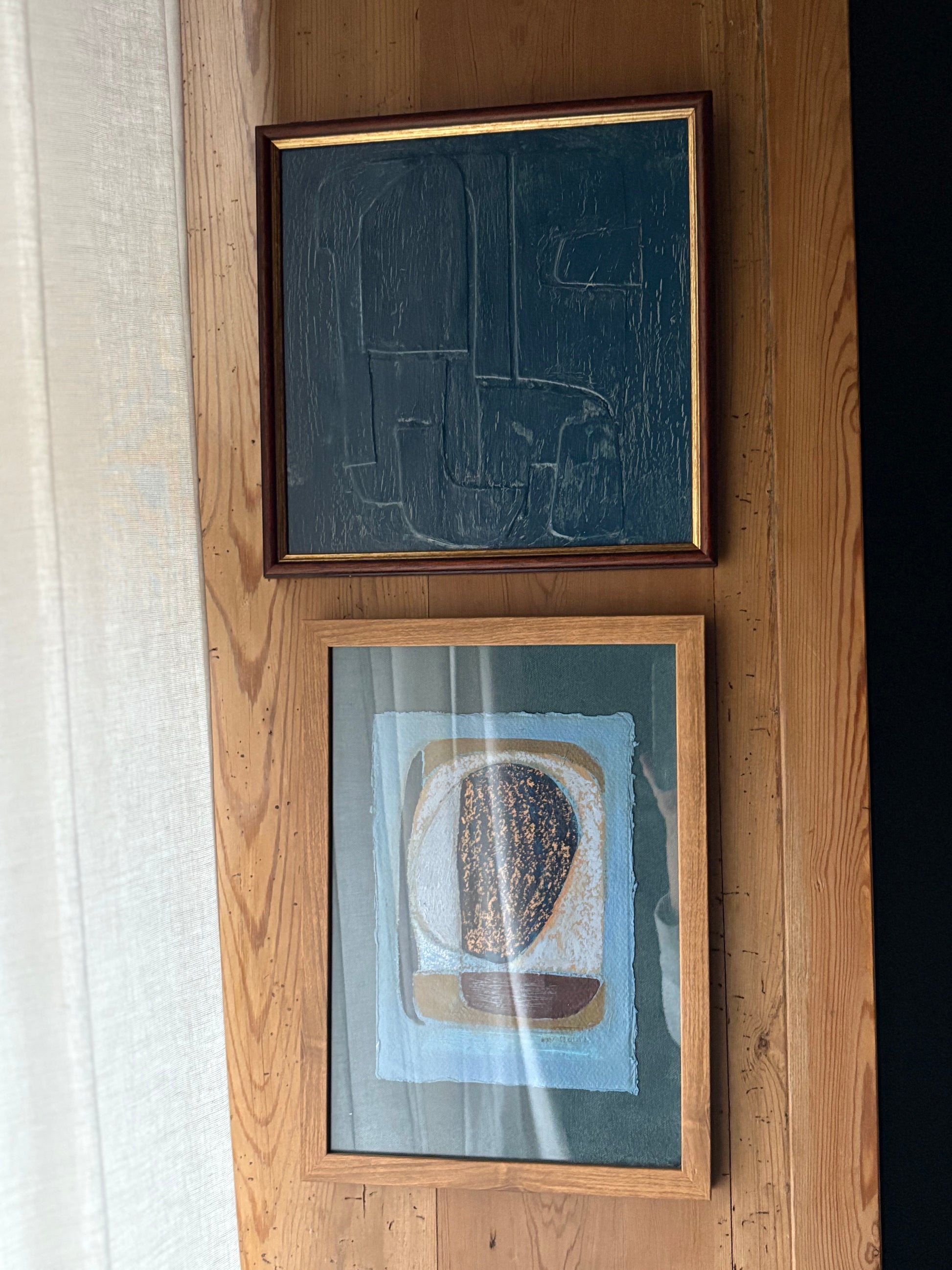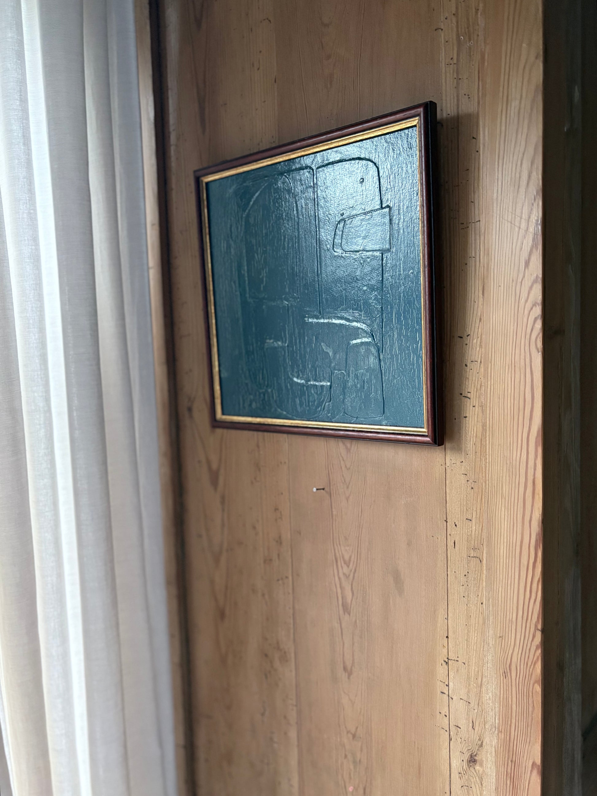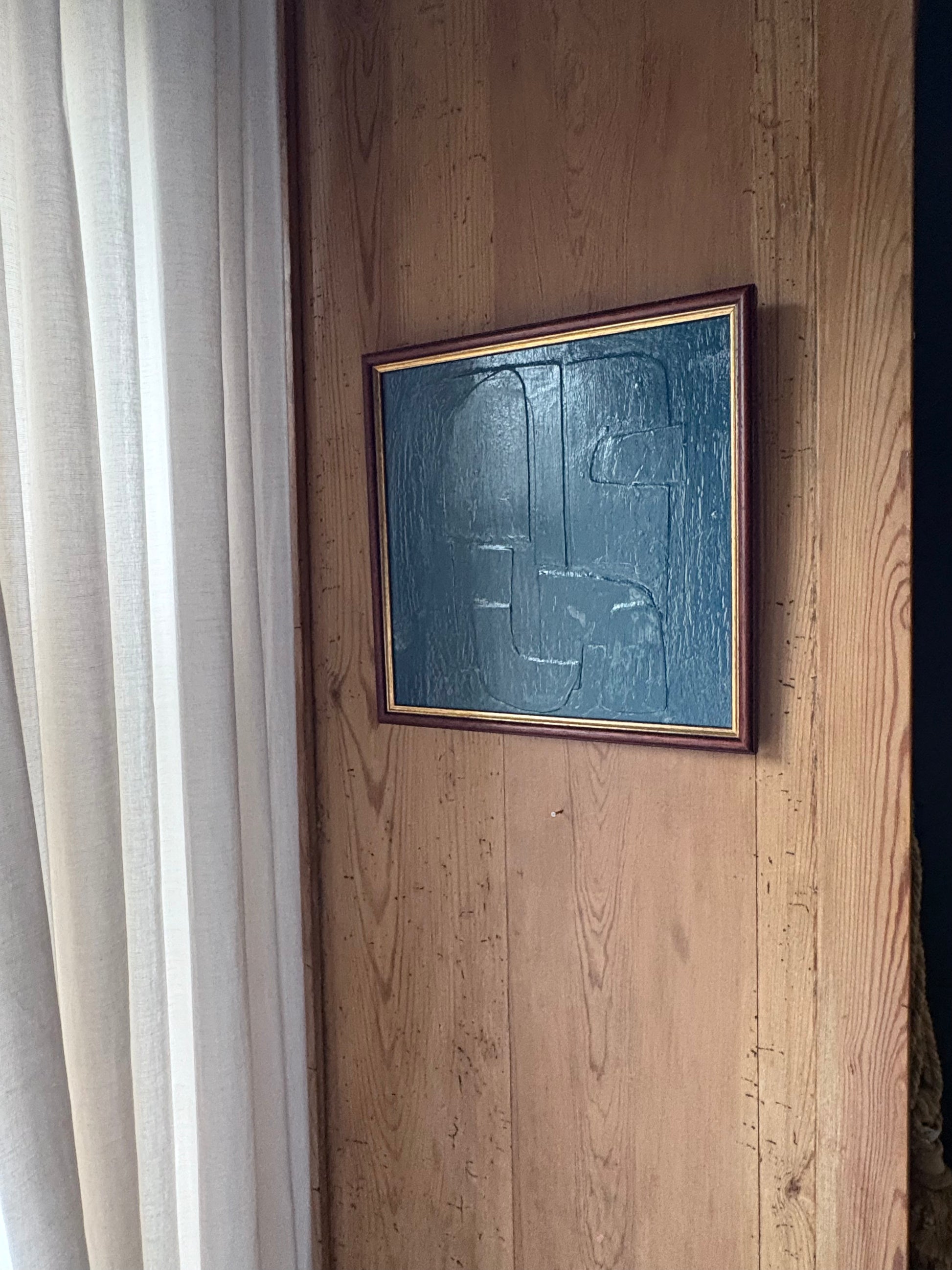 Klein abstract blauw werk met een glossy craquelé finish over abstract compositie van vormen, uit de "winter blues" serie .