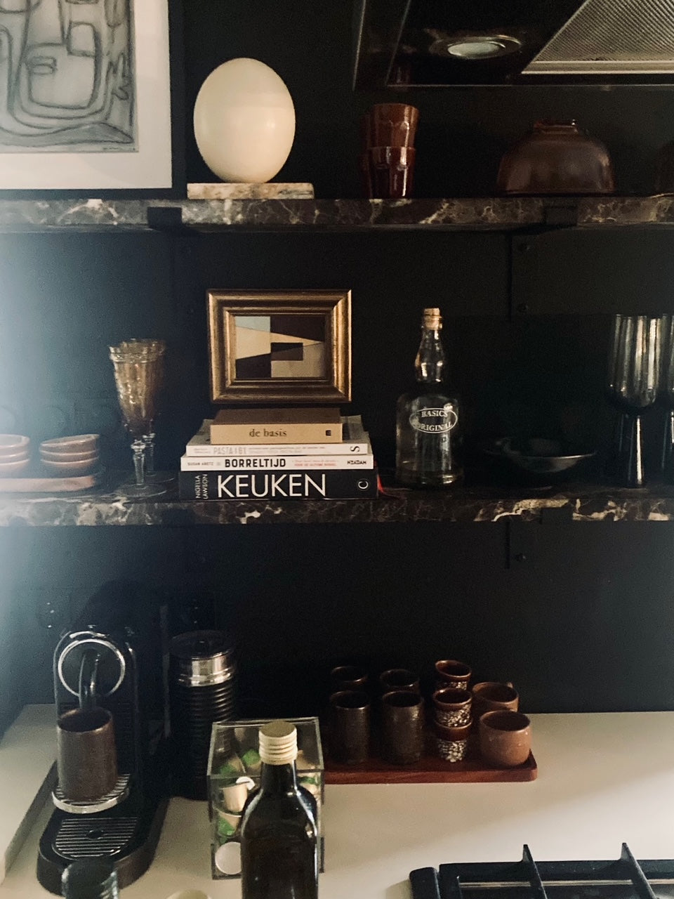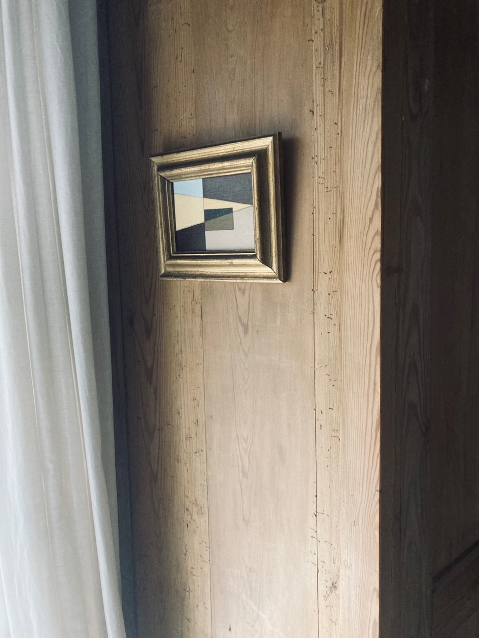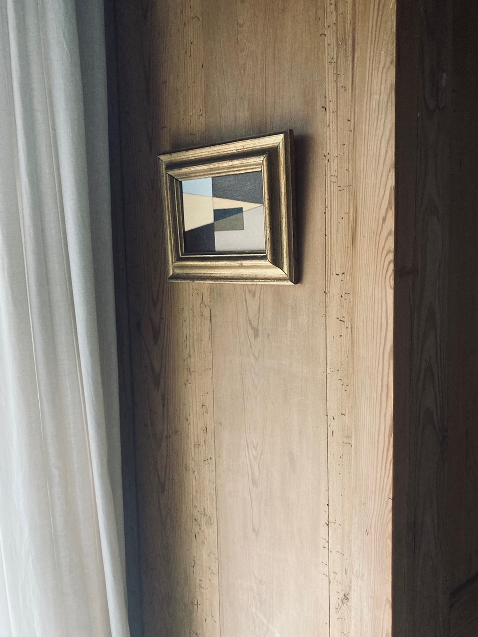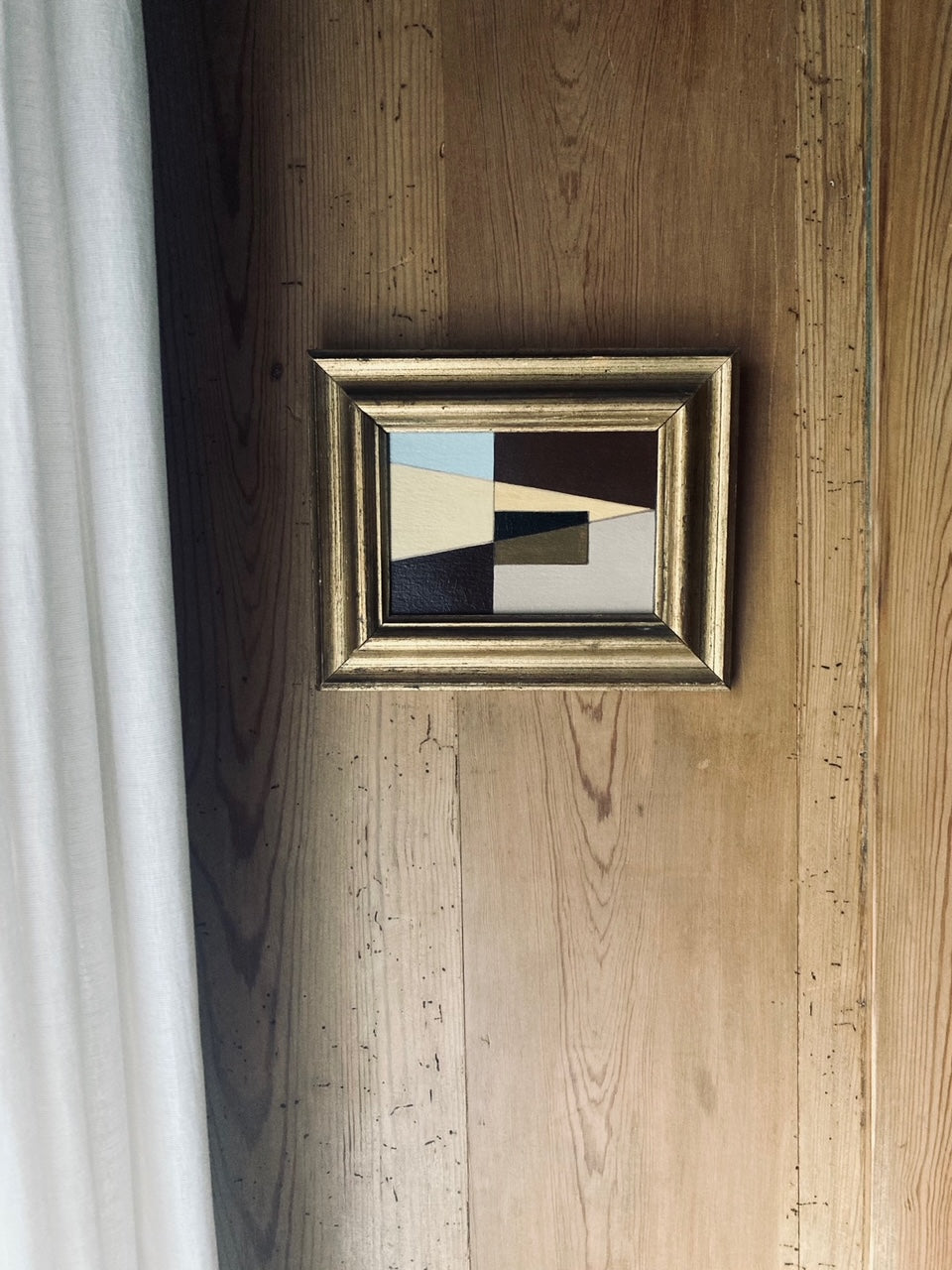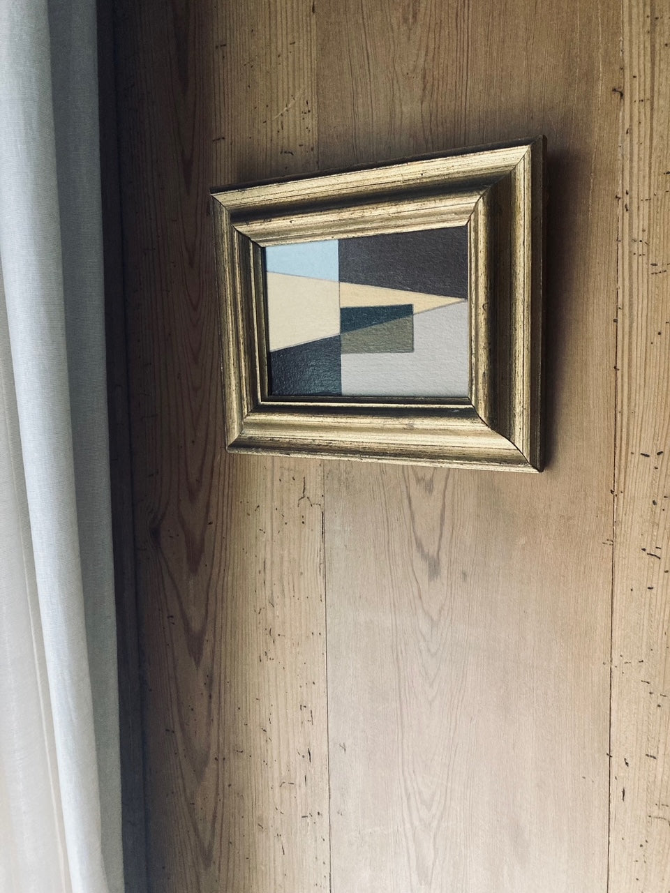 klein abstract werkje in contrasterende kleuren vlakken. een moderne compositie in een klassiek echt antiek verguld gouden lijstje van hout. acryl op karton Afgewerkt met een glossy vernis.
